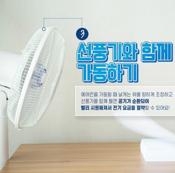 선풍기를 함께 사용하면 찬 공기를 빠르게 순환시켜 에어컨 설정 온도를 높게 유지해도 시원함을 그대로 느낄 수 있습니다.